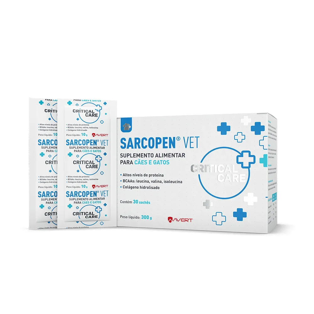 Sarcopen Vet é um suplemento alimentar desenvolvido para auxiliar na manutenção e recuperação da massa muscular de cães e gatos. Sua fórmula concentra altos níveis de proteína de alta qualidade, aminoácidos essenciais (BCAAs: leucina, valina e isoleucina) e colágeno hidrolisado, promovendo suporte à saúde muscular e articular.
